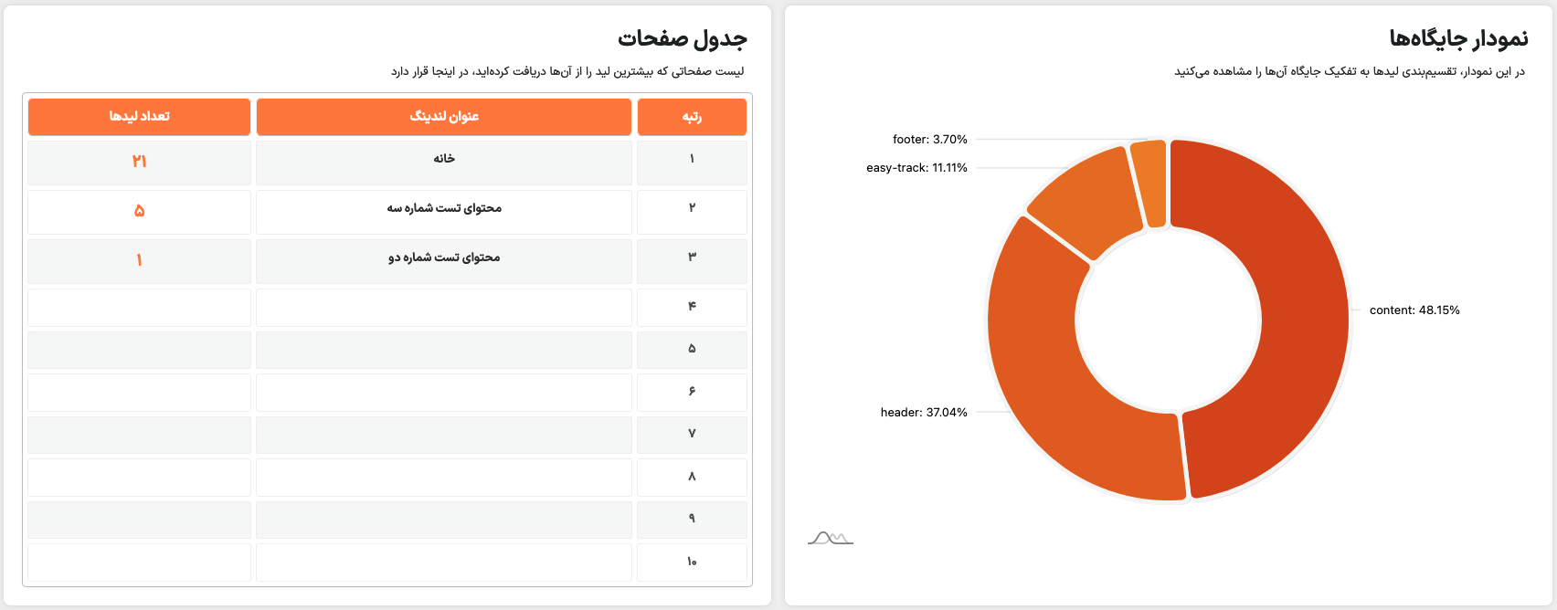 در بخش بعدی شما میتوانید اطلاعاتی را درباره اینکه لیدهای شما از چه جایگاههایی بدست آمده در بخش «نمودار جایگاهها» بدست بیاورید. همچنین میتوانید از «جدول صفحات» برای اینکه بدانید کدام صفحات شما بیشترین لید را ایجاد میکنند استفاده کنید. از اطلاعات این بخش میتوانید برای بهینهسازی کمپینهای فروش خود بسیار استفاده کنید.